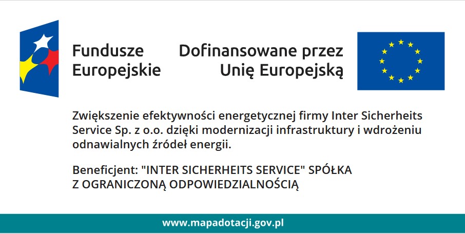 "INTER SICHERHEITS SERVICE" SPÓŁKA Z OGRANICZONĄ ODPOWIEDZIALNOŚCIĄ uzyskała dofinansowanie z Unii Europejskiej na realizację projektu pt. „Zwiększenie efektywności energetycznej firmy Inter Sicherheits Service Sp. z o.o. dzięki modernizacji infrastruktury i wdrożeniu odnawialnych źródeł energii.”